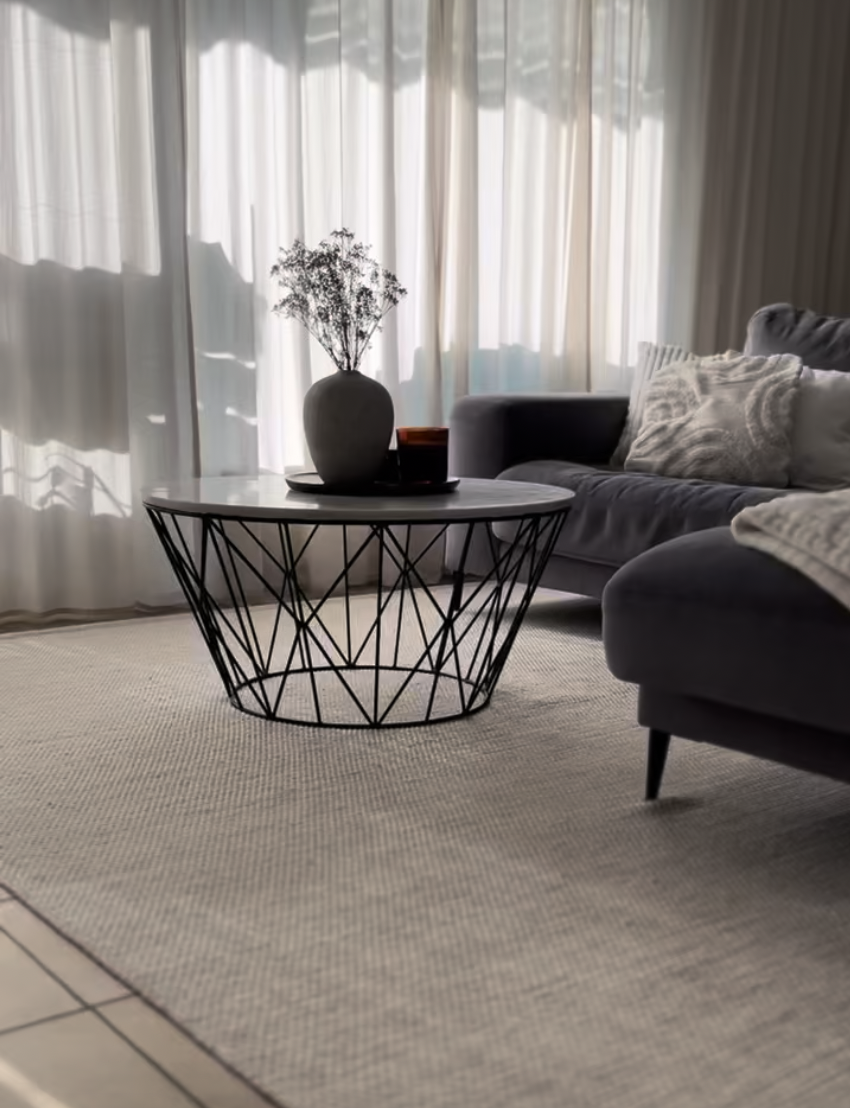 Nichts verwandelt einen Raum schneller als ein großer Teppich. Gerade in Mietwohnungen mit Laminat oder Fliesen kann ein Teppich den Raum direkt wohnlicher machen. Ich habe einen großen, hellen Teppich ins Wohnzimmer gelegt, der den Sitzbereich optisch zusammenfasst und gleichzeitig für Wärme sorgt. Er bildet dadurch eine Art „Cozy Zone“. Meinen Teppich findest du hier (Affiliate-Link).