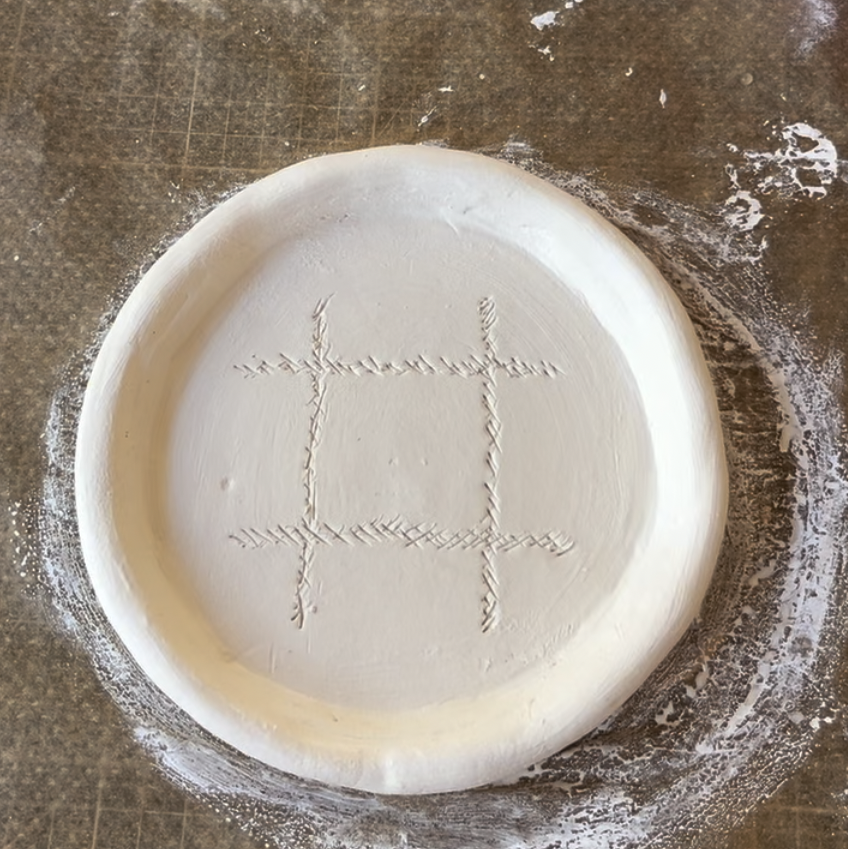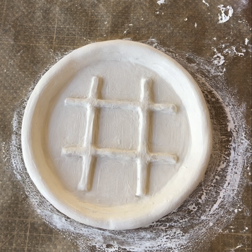 Markiere das TicTacToe-Muster auf deiner Grundfläche, ritze die Linien leicht ein und befeuchte sie. So haften die Tonstreifen besser. Lege die zugeschnittenen Tonstreifen darauf und verblende die Kanten wieder sorgfältig mit der Platte. Das Gitter sollte stabil, aber glatt eingearbeitet sein.