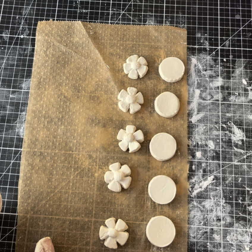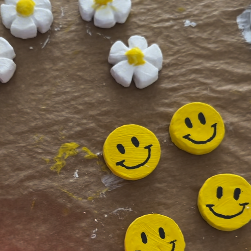 Ich habe mich für kleine Smileys und Blumen entschieden. Für die Smileys habe ich einfach kleine Kreise mit einem Ausstecher ausgestochen. Die Blumen habe ich per Hand geformt. Aber hier kannst du natürlich deiner Kreativität freien Lauf lassen.