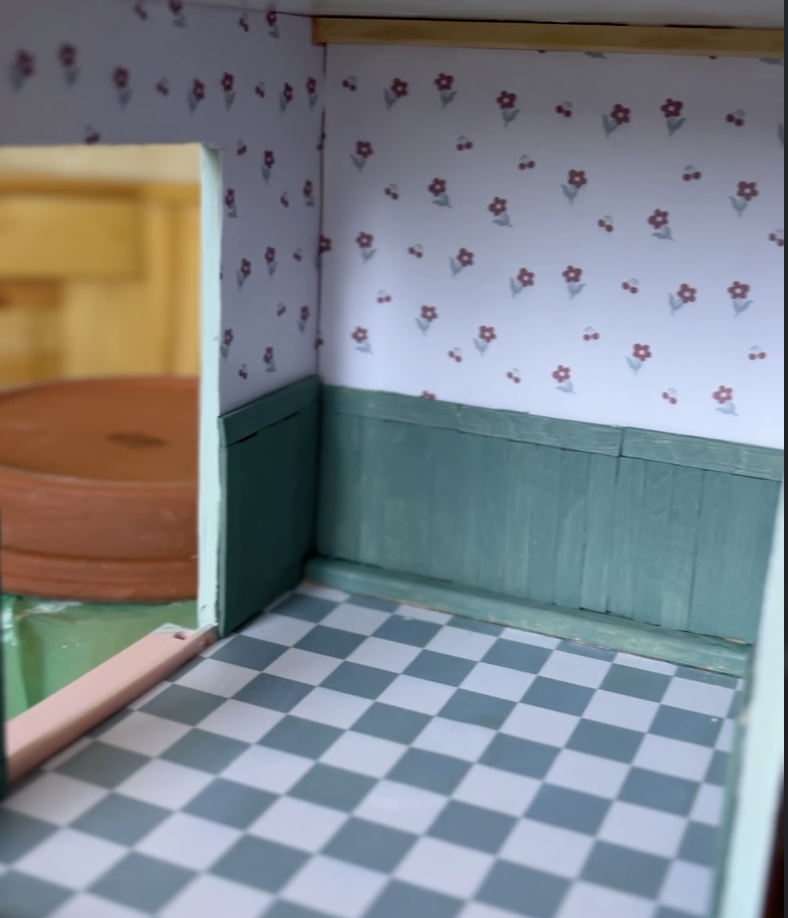 Für die Küche habe ich kleine Paneele aus Eisstielen gefertigt. Ich habe dafür eine Papier-Vorlage mit den genauen Maßen der Küchenwände gebastelt, die Stiele darauf geklebt, gestrichen und dann mit Mod Podge an den Wänden befestigt. Das verleiht der Küche meiner Meinung nach ein liebevolles, handgearbeitetes Detail, was das Puppenhaus noch gemütlicher wirken lässt.