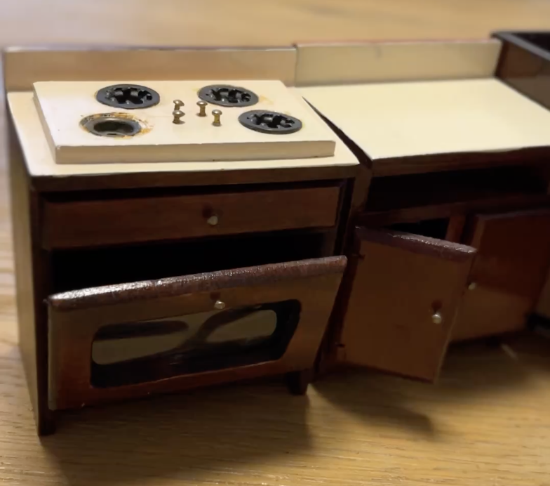Dann habe ich von meiner Mutter alte Puppenhaus Möbel, die sie selbst noch im Keller gefunden hat vermacht bekommen. Die Esszimmermöbel, bestehend aus Tisch, Stühlen und Uhr, habe ich so belassen. Die Küche habe ich etwas geupcycelt und aus dem vorherigen dunklen braun ein helles grün gezaubert. Ich hatte sehr lange überlegt ob das eine gute Idee ist, bin nun aber sehr froh diese Mischung gemacht zu haben.