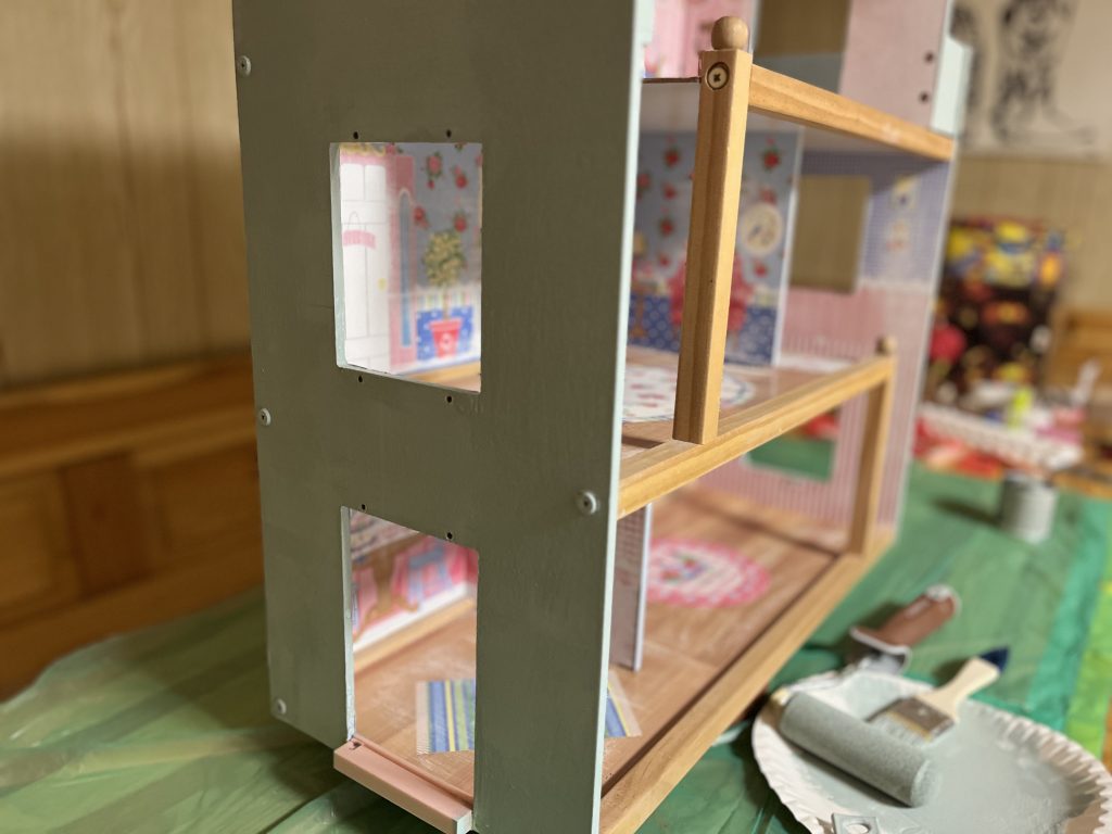 Anschließend habe ich das Haus in einem hellen Grünton gestrichen, den habe ich gemeinsam mit meiner Tochter im Baumarkt ausgesucht. Ich habe eine matte Kreidefarbe für Möbel genutzt. Die Farbe verleiht dem Puppenhaus sofort ein frisches, freundliches Aussehen.