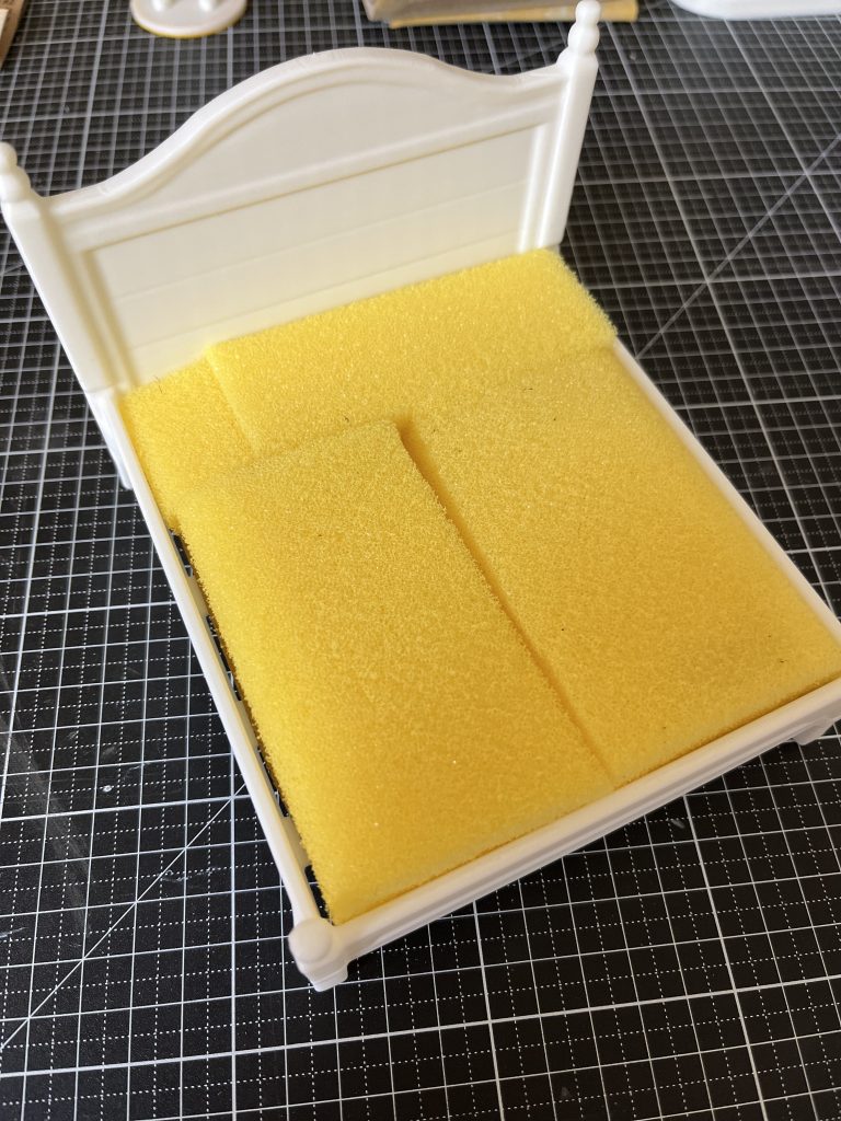 Aus Karton und etwas Farbe habe ich einen großen Standspiegel gebastelt. Für das 3D gedruckte Bett habe ich aus Spülschwämmen, etwas Filz und einem alten Vorhangstoff eine Matratze gebastelt. Ein Bettdeck und Kissen stehen noch auf meiner ToDo Liste.