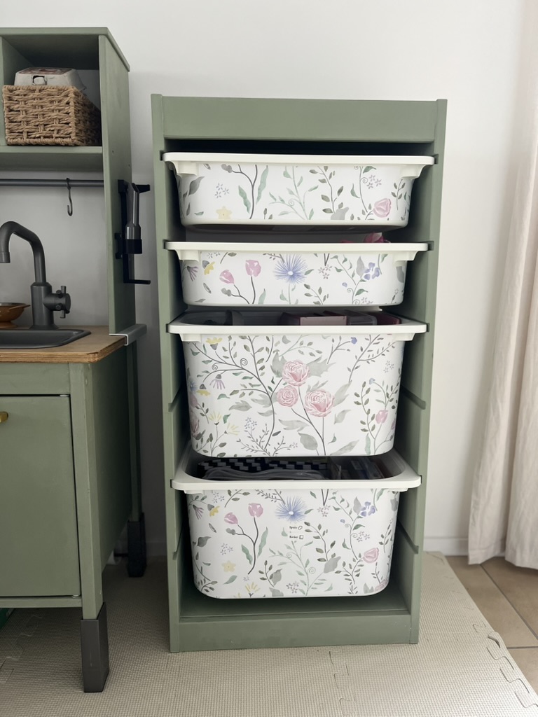 Die klassischen weißen Trofast Boxen habe ich mit floraler Möbelfolie beklebt. Je nach Geschmack kannst du hier natürlich ein anderes Muster nutzen.