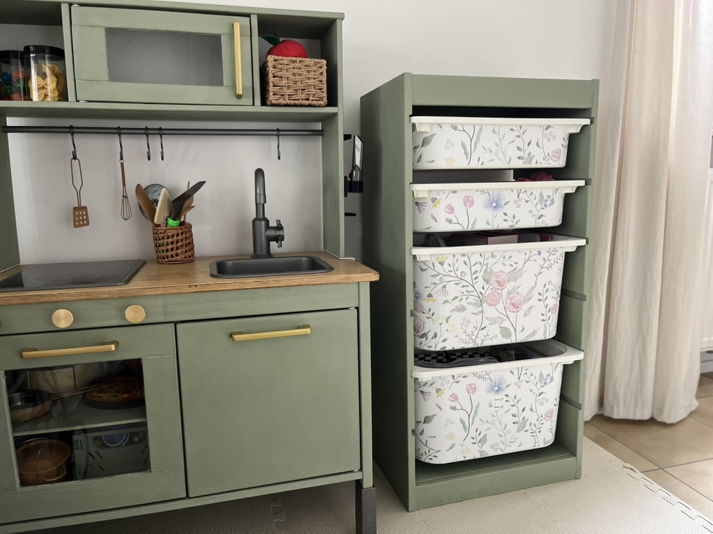 Das Regal steht direkt neben meiner ebenfalls umgestalteten Spielküche und beide sind in der gleichen Farbe gestrichen. Das upcycling der Spielküche kannst du dir hier anschauen.